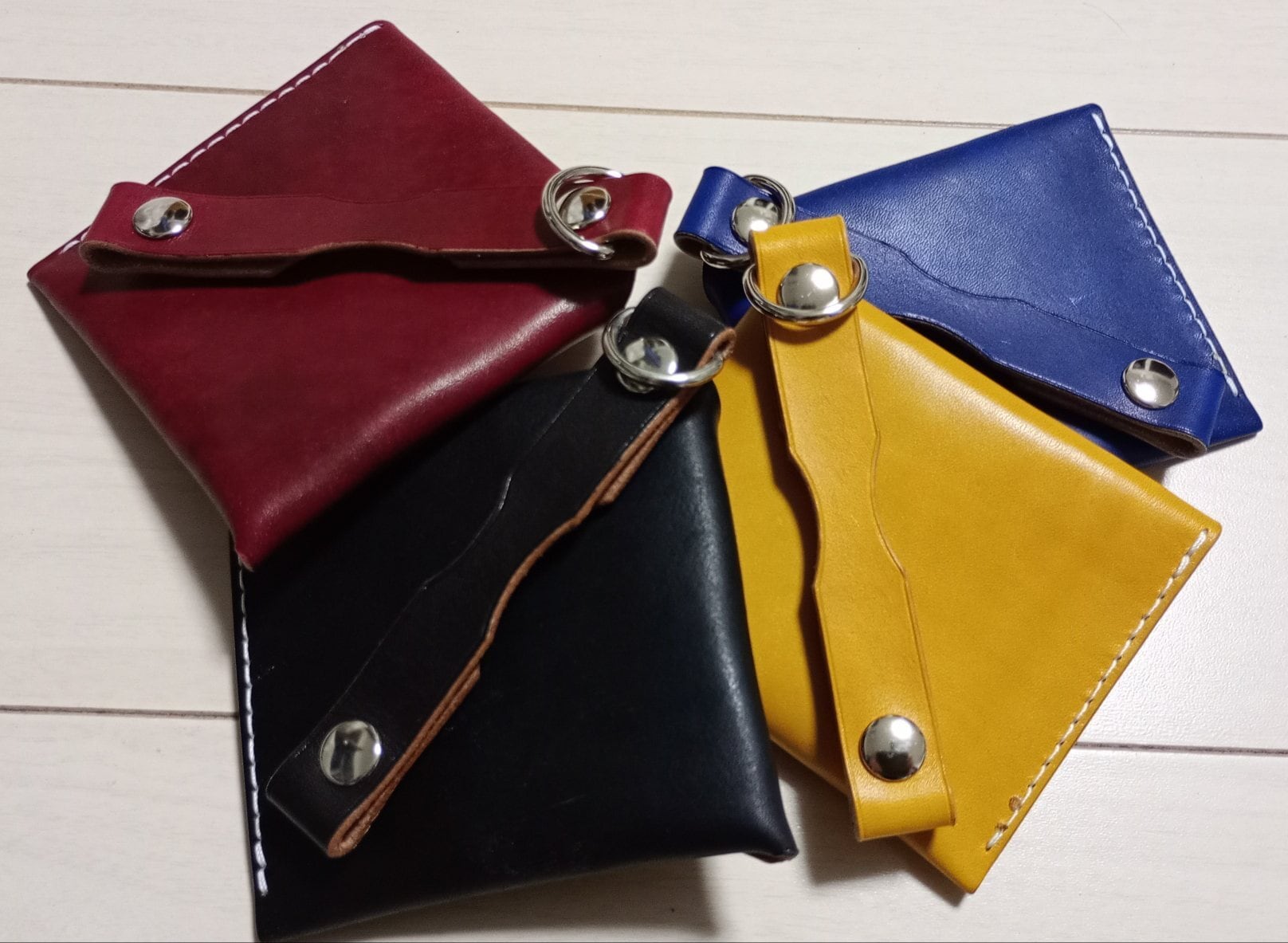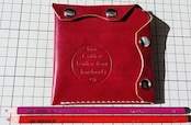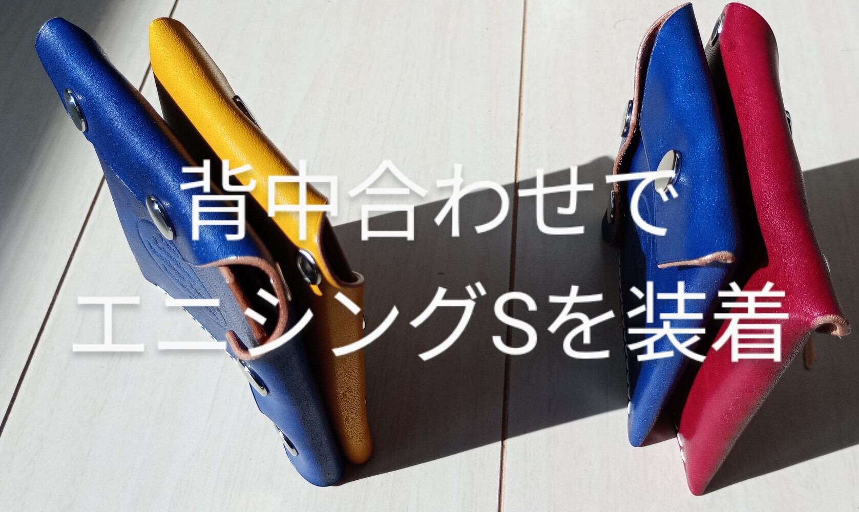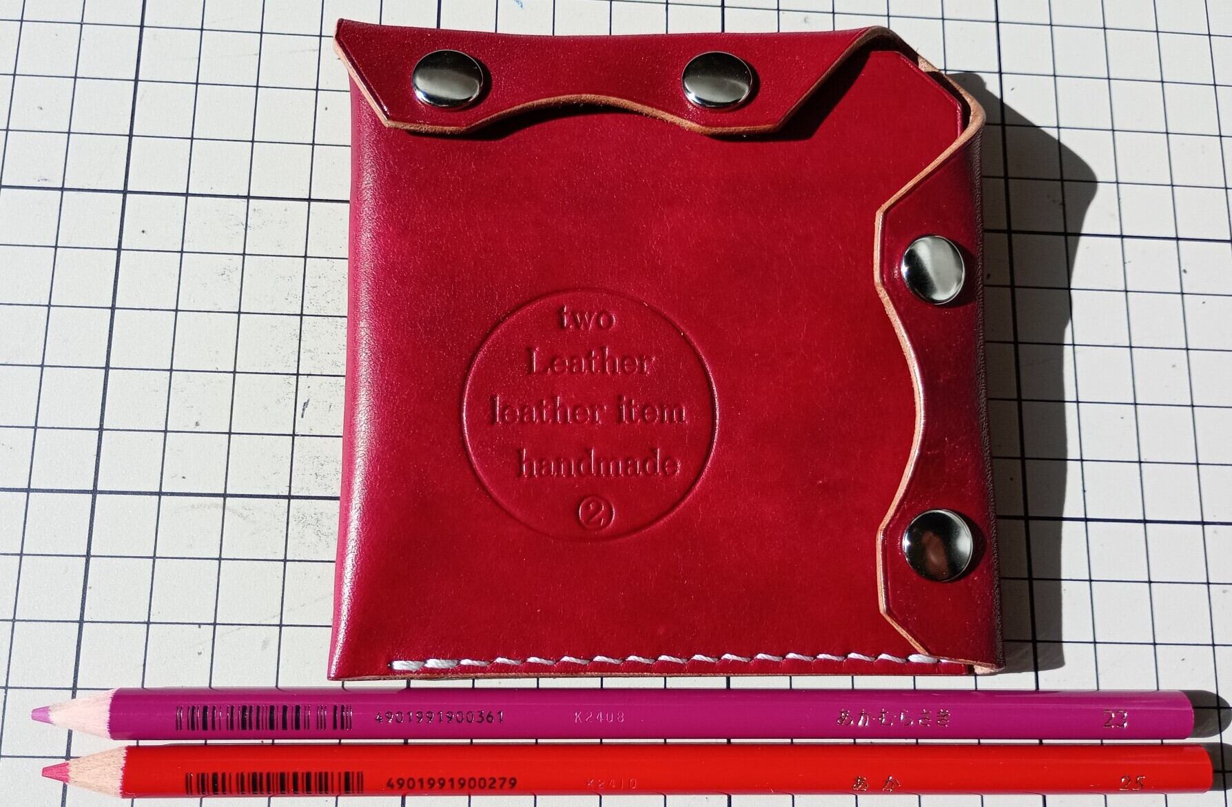 ■ カラー:ブラック・イエロー・チェリーレッド・スカイブルー、色味の参考にトンボ鉛筆カラーペンシルの同系色を並べています/サイズ:縦約10.5cm・横約10.5cm・厚み金具含まず約1.5cm*革の種類によって変わります